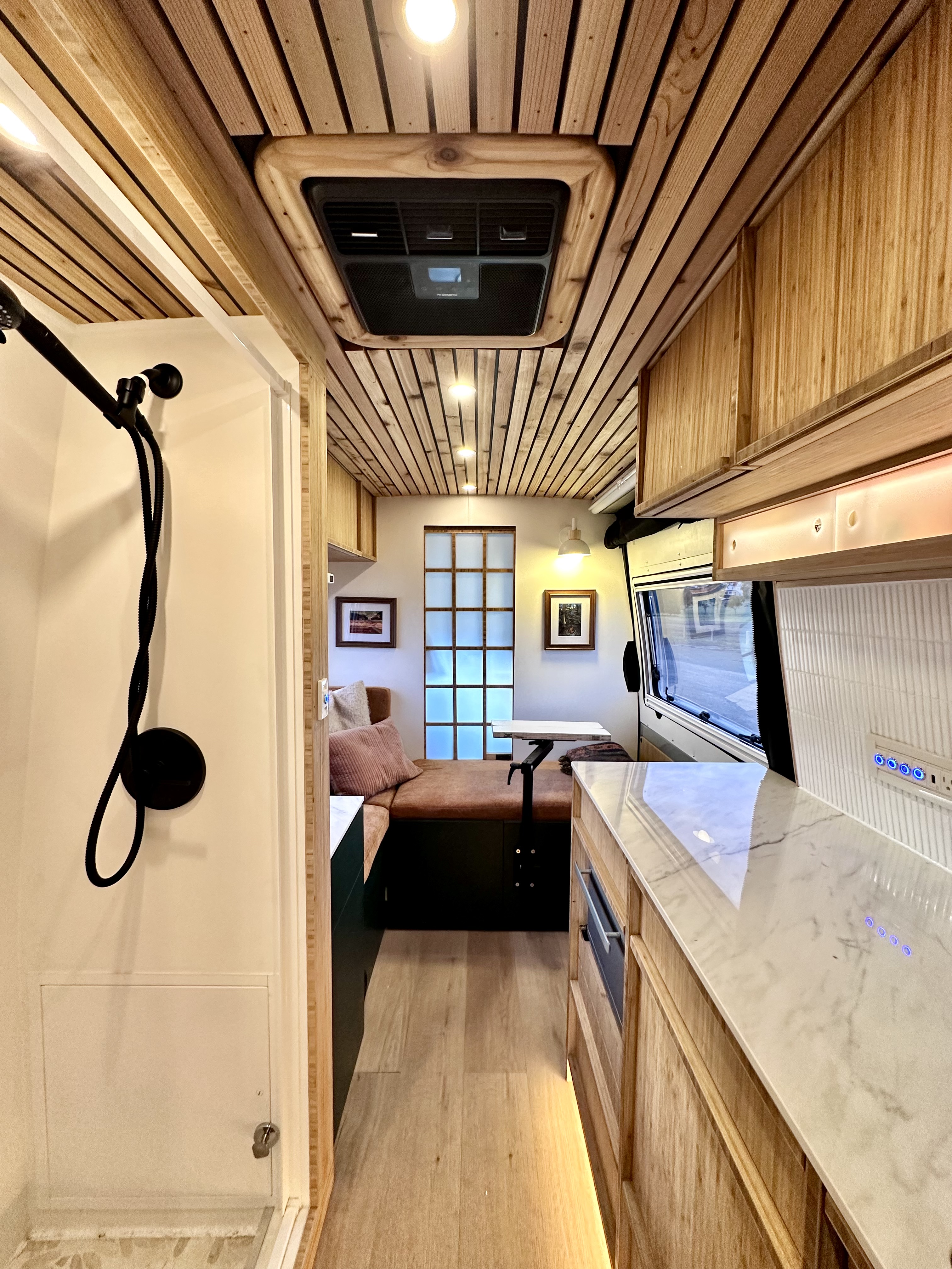 A Japandi-inspired 170″ Sprinter design blending clean Japanese simplicity with cozy, Scandinavian comfort. Complete with a shower, hidden pull-out toilet, full kitchen, and L-shaped sofa that converts to a lounge bed. This van proves that even minimalism can feel inviting.